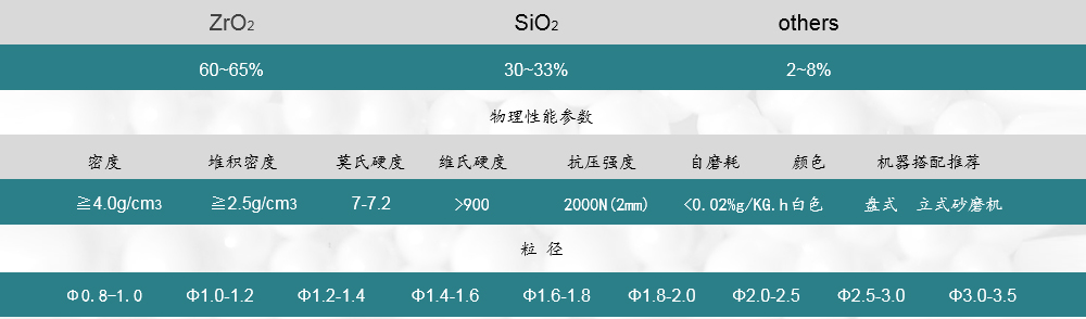 采用滾動(dòng)成型工藝、通過高溫?zé)Y(jié)制成,珠子內(nèi)部硅酸鋯微粒均勻致密,密度和硬度適中,適合中低黏度物料的研磨和分散,可匹配大部分市面上的砂磨機(jī)。